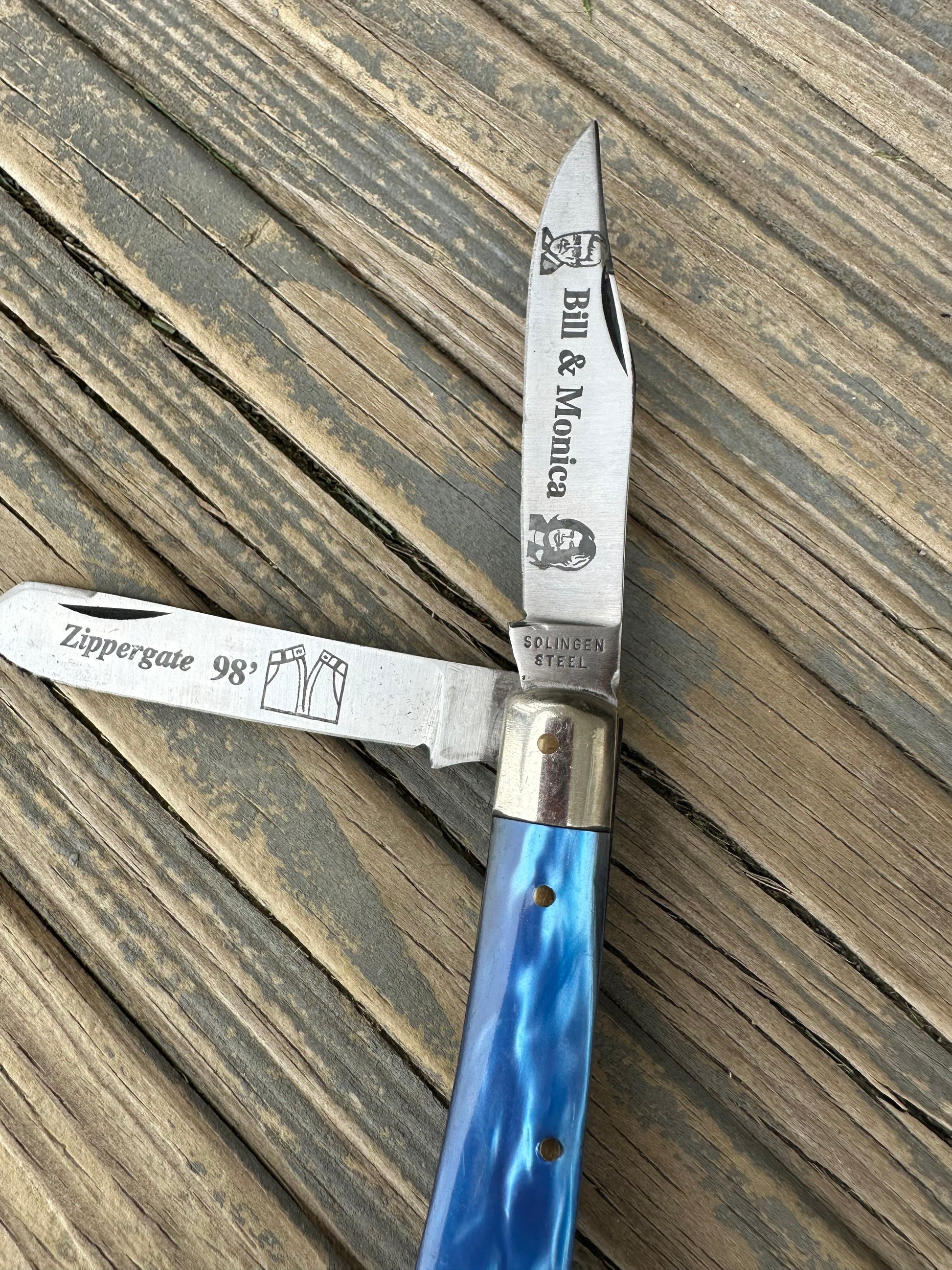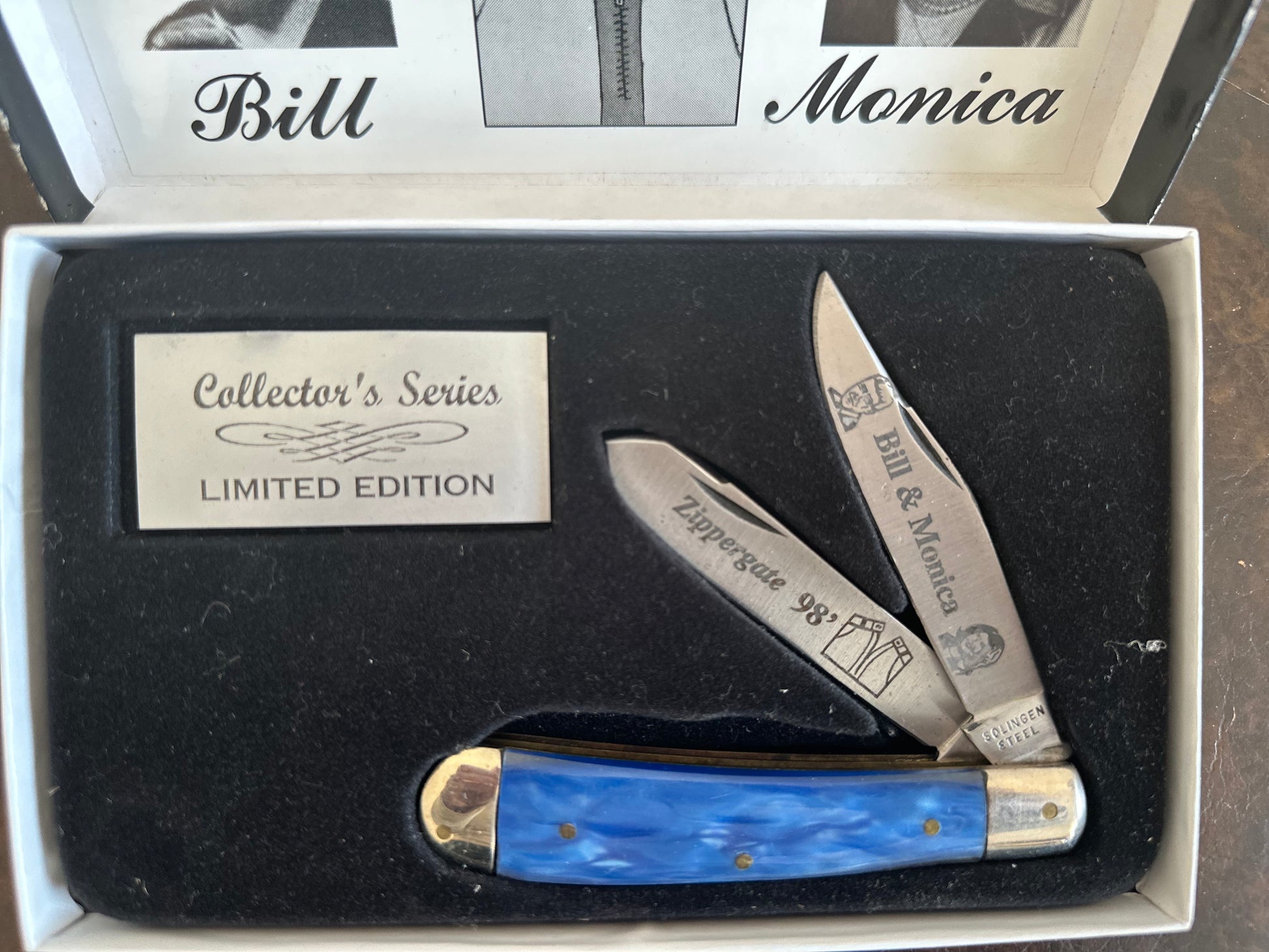 Step into history with this rare and unique 1998 Bill Clinton and Monica Lewinsky Collector's Series "Zippergate" Limited Edition foldable knife. A true conversation piece, this commemorative knife pays tribute to one of the most talked about moments in American political history.